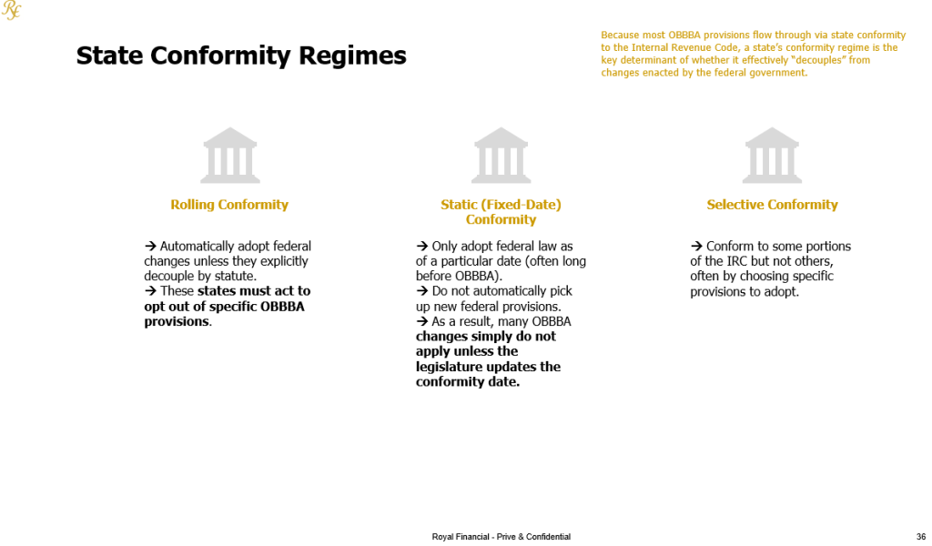 - Static (Fixed-date) Conformity -> Only adopt federal law as of a particular date (often long before OBBBA). They do not automatically pick up new federal provisions. As a result, many OBBBA changes simply do not apply unless the legislature updates the conformity date.